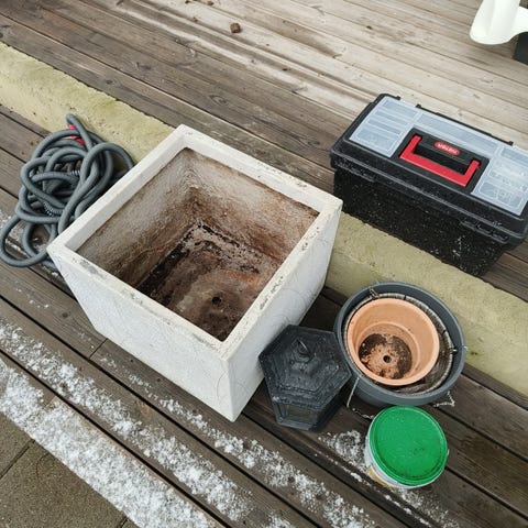 Annetaan lavakaulus jalustalla yrttien kasvatukseen. Jos joku sattuu tarvitsemaan niin saa hakea ennen kaatikselle vientiä.