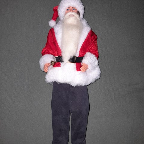 Tässä barbille oma joulupukki. Harmaana parran ja tukan alla ei ole Ken, vaan tuntematon miesnukke, jolla juhlapuku ja mustat kengät.