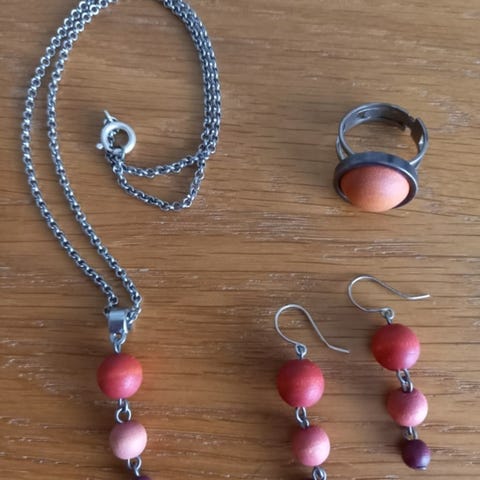 Aarikan korvikset ja rintakoru. Näyttävä setti vaikka jouluksi. Hakea voi tänään tai huomenna. Korvakoru, korvikset, rintakoru, korusetti, punaiset korut, punaiset korvikset, puiset korvikset, Punainen rintakoru, punainen korusetti
