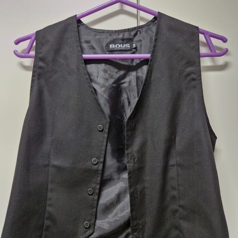 Laadukas ja moitteeton kokonaisuus; tumma takki, harmaat housut ja liivi, paita sekä kravatti.
