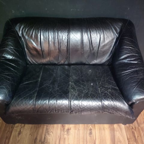 Sohva on siistissä kunnossa, mutta oikea käsinoja on hieman hajalla. Käsinoja heiluu hieman ja käsinojan päässä pieni kuoppa. Ei näy päälle päin ja sohva näyttää siistiltä.