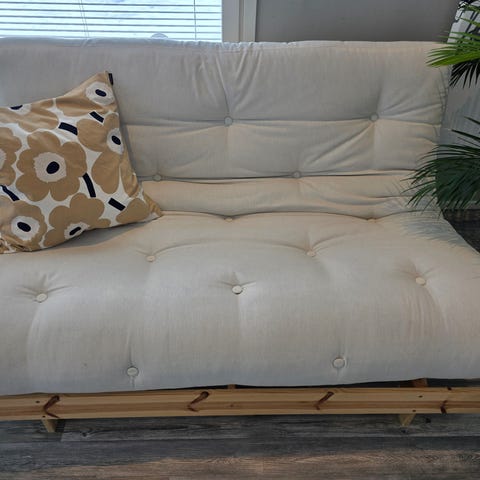 Karup Design Roots -futonsohvan runko. Hyvässä kunnossa; ei halkeamia tai kolhuja. Joitain lasten lyijykynätöherryksien jäänteitä saattaa olla, kun niitä pyyhittiin pois. Patjaa ei tähän kauppaan sisälly.