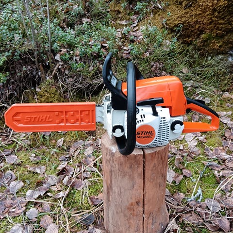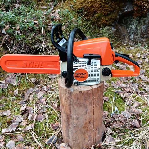 Stihl 023 C moottorisaha, oranssi ja valkoinen väri, polttomoottorikäyttöinen. Soveltuu puun sahaamiseen ja muihin metsätöihin.