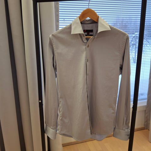 Myydään Dressmanin Slimfit kauluspaita koossa M eli 39/40 (kapeampi malli). Sävy navy/tummansininen, aavistus satiininhohtoa. Hyvä käytetty kunto, aavistus vaaleaa kulumaa hihansuiden ja kauluksen käännöskohdissa. Myynnissä myös muita miesten vaatteita, voi kysyä postikulujen yhdistämistä. Yritän postittaa nopeasti. Pesty hajusteettomasti. Uudehko, savuton koti, ei lemmikkieläimiä. Toridiili tai nouto Torniosta.