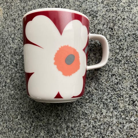 Marimekko Unikko muki, jossa on keltainen kukkakuosi. Muki on valmistettu keraamisesta materiaalista. Oiva Unikko muki 2,5 dl.