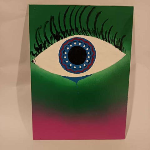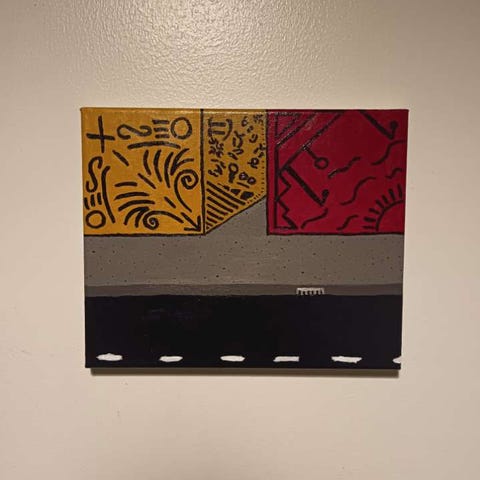 Abstrakti maalaus, jossa on värikäs tausta ja erilaisia kuvioita, kuten pelikortteja, pullo ja muita elementtejä. Taideteos on moderni ja visuaalisesti monimuotoinen. Tehty akryylimaalien ja spraymaalien avulla. kuvastaa addiktioita ja huumausaineiden mielen valtausta ja siitä kontrollin menettämistä.