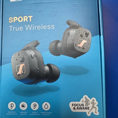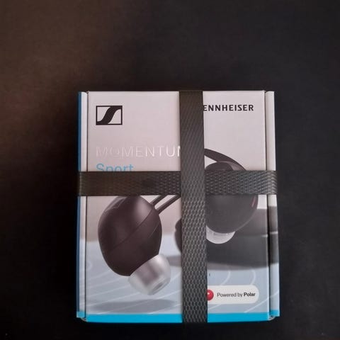 Sennheiser Momentum Sport langattomat kuulokkeet. Kuulokkeet on suunniteltu urheilukäyttöön ja ne tarjoavat hyvän istuvuuden ja äänenlaadun. Mukana on korvasovitteet mukavuutta varten.