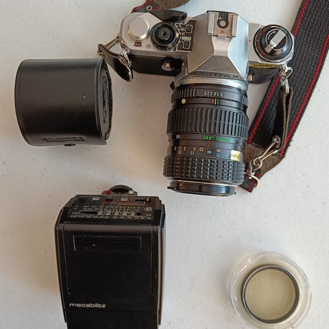 Myydään erittäin kattava ja hienosti säilynyt Pentax Program Plus (Program A) -filmikamerajärjestelmä. Tämä setti sisältää kaiken tarvittavan harrastuksen aloittamiseen tai kokoelman täydentämiseen.