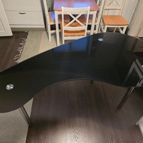 Vanhasta ovesta tehty pöytä. Päällä 6mm lasilevy. Alla Ikean pukkijalat.