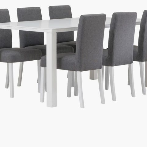 Reilu vuoden verran käytössä ollut 6 hlön ruokailuryhmä. Vekestä ostettu pöytä ja tuolit. Yhdessä tuoleista on tullut vaurio maalipintaan istuintasolle. Helppo peittää esim pehmusteilla. Pöytälevy on kokopuuta. Omat kantajat mukaan. Tuolien jalat irrotettavissa.