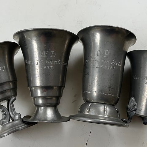 Luultavasti alpakkaa. Korkeampi n. 8 cm halkaisija 6 cm. Kaiverrus 1 P maastoj miehet 35 v Porin mlk Matalamman korkeus n. 7 cm kaiverrus 1-P sarja 67 kg 1 euroa kpl
