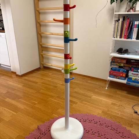 IKEA lastenvaatepuu, jossa on värilliset koukut. Sopii lastenhuoneeseen vaatteiden ja asusteiden ripustamiseen.