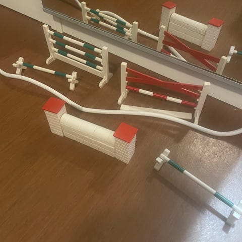 Schleich hevonen ja estesetti. Settiin kuuluu esteradan osat, jotka sisältävät 3kpl sinistä kartioita, 2kpl punaisia puomeja sekä 4kpl hyppy palikoita. Setti soveltuu keräilyyn ja leikkiin.