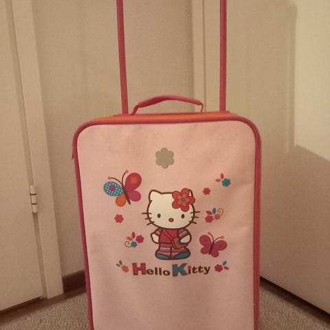 Vaaleanpunaiset Hello Kitty taaperokärryt. Kahva vaatii kiristystä.