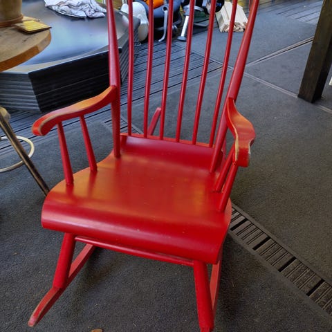 Mustaksi maalattu vanha keinutuoli valmistettu puusta. Tuolissa on selkänojan pystysuorat tukipuut ja käsinojat. Soveltuu sisäkäyttöön. Vain nouto Kangasalta.