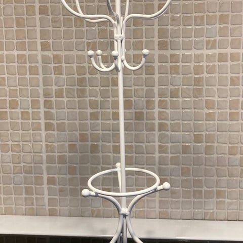 Myydään valkoinen koruteline jossa 3 pylvästä ja tarjotin.