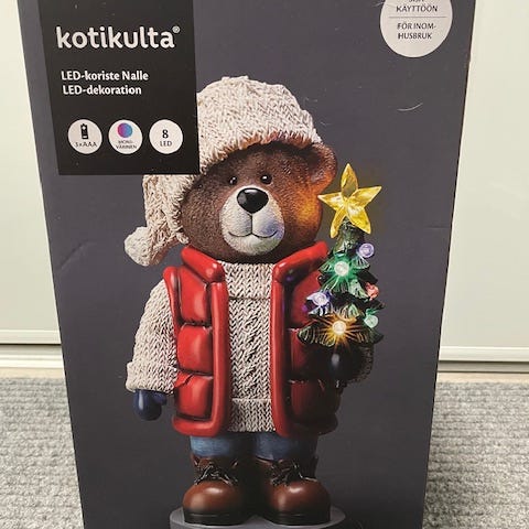 Jouluinen pehmeä valkoinen nalle viuluineen, joka soittaa "jouluyö, juhlayö" sävelmää ja siivet saavat kauniin värisävyn. Toimii paristoilla, Ei postitusta Hinta: 15