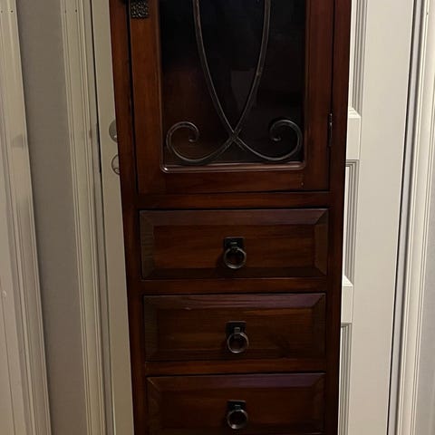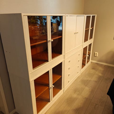 Valkoiseksi maalattu puinen lipasto. Kaikki vetimet tallella, ei ole vaan kiinnitetty. Siisti!