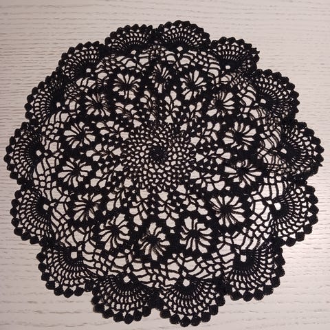 Olisi myynnissä iso musta virkattu pöytäliina. Halkaisija on n. 63 cm. Materiaali on puuvillaa. Voin lähettää jolloin ostaja maksaa kulut.