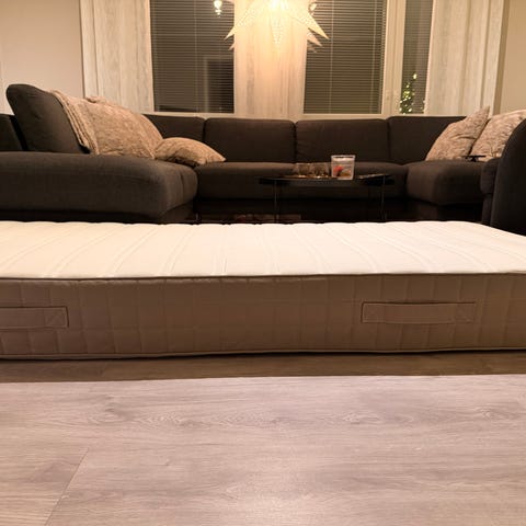 Ikea runkopatja, koko 80x200 cm. Runko on verhoiltu vaaleanharmaalla kankaalla ja siinä on tammiset jalat. Sänky on ollut yhdellä lapsella neljä vuotta käytössä, kunto ok.