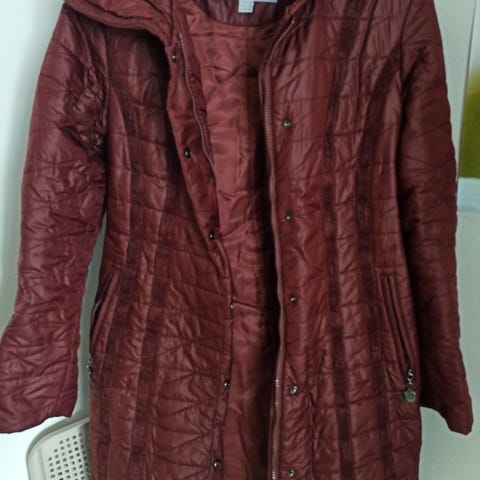 Naisten 3/4-mittainen, A-linjainen välikausitakki. Kangas on polyesterisekoitetta. Kiinnitys kolmella suurella napilla. Kaulukset näyttävästi rypytetty. Kangas on yleisilmeeltään siisti, en tosin ole nyt kuvia varten pintaa siistinyt.