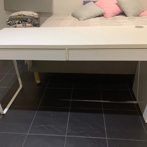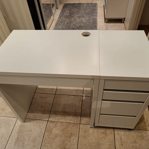 Työpöytä Ikea Micke, jossa on valkoinen pinta ja punaiset reunat. Pöydässä on yksi kaappi ja kaksi laatikkoa, jotka tarjoavat säilytystilaa. Pöydän kannessa on reikä kaapeleille.