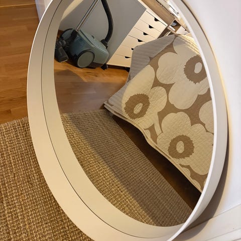 IKEA peili, jossa on rottinki kehys. Peilin takana on ripustuslenkki, joka mahdollistaa helpon kiinnityksen seinälle. Kehyksen materiaali on luonnollinen rottinki, ja peilin muoto on pyöristetty suorakaide.(käsin punottu)