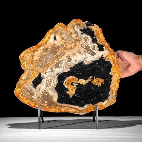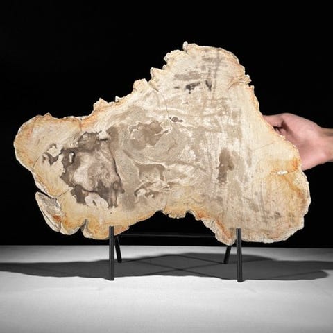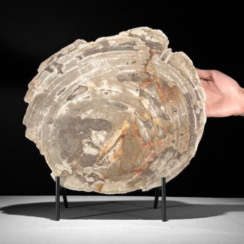 Upea suuri pala fossiloitunutta puuta räätälöidyllä jalustalla.