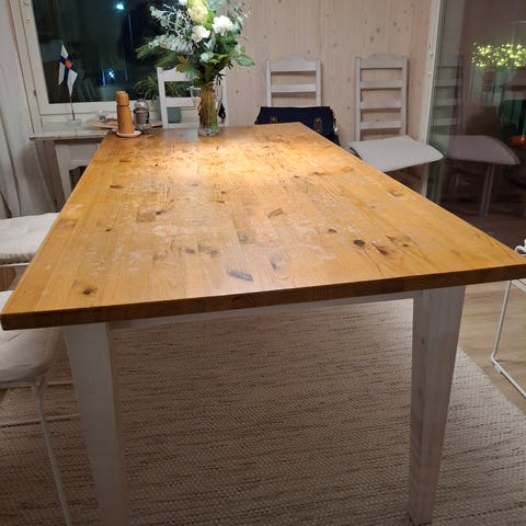Annetaan pyöreä ruokapöytä. Hankittu käytettynä, maalattu valkoiseksi ja käytön kulumaa pinnassa. Osa ruuveista pöydän alta puuttuu, mutta on pysynyt tukevasti kasassa vuoden ajan.