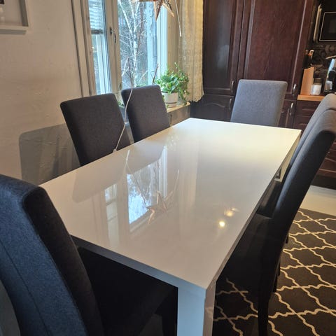Pöytä on hyvässä kunnossa, eikä siinä ole juurikaan käytön jälkiä. Ulkonäöltään siisti ja moderni. Pöydässä on metallijalat sekä kätevä pidennysosa, jonka avulla pöydän kokoa voi suurentaa tai pienentää tarpeen mukaan.