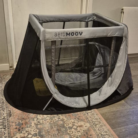 Jokusen kerran käytetty matkasänky, kaikki osat tallessa ja ehjä on. Pari jälkeä siellä täällä, ja patjassa myös, lähtisi varmaan kyllä hinkkaamalla. Aina sisällä säilytetty.