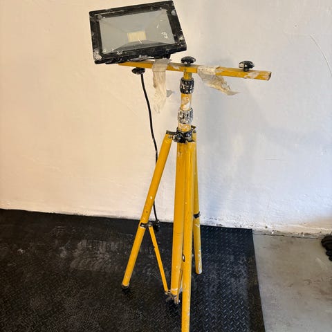Myydään työmaavalaisin kolmijalalla, korkeus n. 1,5 m. Valaisin toimii, vaikka vain puolet ledeistä syttyy. Johto on korjattu teipillä, mutta valaisin on edelleen käyttökelpoinen. Kolmijalkaan voi laittaa myös uuden valaisimen. Sopii kevyempään työmaakäyttöön tai tilapäiseksi valaisuksi.