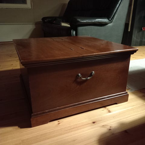 Olohuoneen pähkinän ruskea arkkupöytä, siistissä kunnossa paitsi yhdestä kulmasta pikkusen "maistettu" pienemmän koiran toimesta (näkyy kuvassa)
