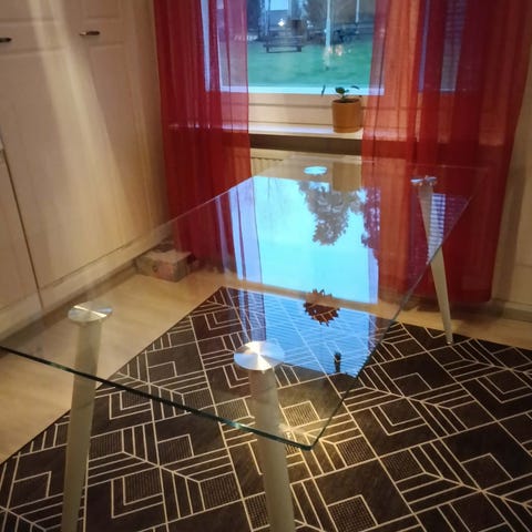 Pöydän reunassa vähän säröä (kuva) ja yhdele tuolin istuimelle pudonnut vähän steariinia (varmasti korjattavissa)