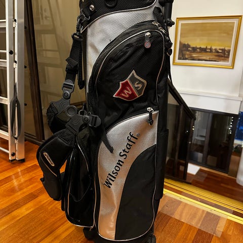 Wilson golfbägi. Todella vähäisellä käytöllä ollut kantobägi. Mukana suojahuppu mailoille. Ei mitään virheitä tai puutteita.