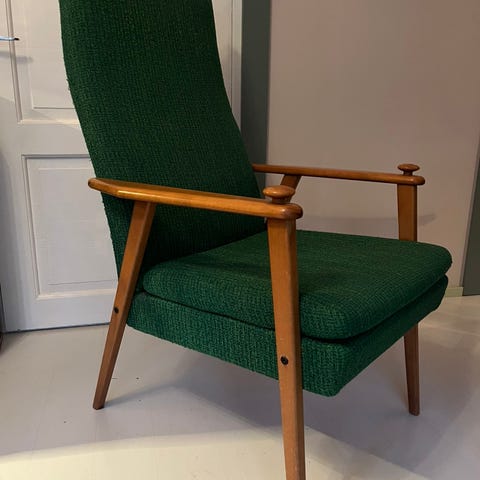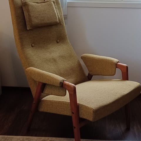 Askon 1950 luvun nojatuoli alkuperäisellä päällysteellä. Pieniä elämän jälkiä.