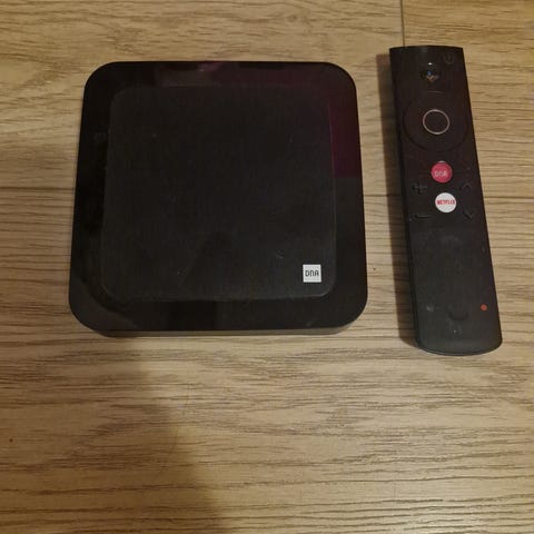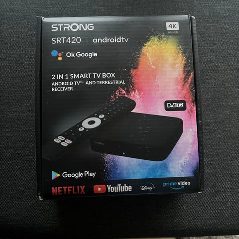 Strong SRT420 Android TV Box 4K -laite, jossa on Android TV ja DVB-T2-terrestriaalivastaanotin. Mukana kaukosäädin ja tarvittavat kaapelit. Tukee Google Play -sovelluksia, Netflixiä, YouTubea, Disney+ ja Prime Video -palveluita. Ostettu 3/25