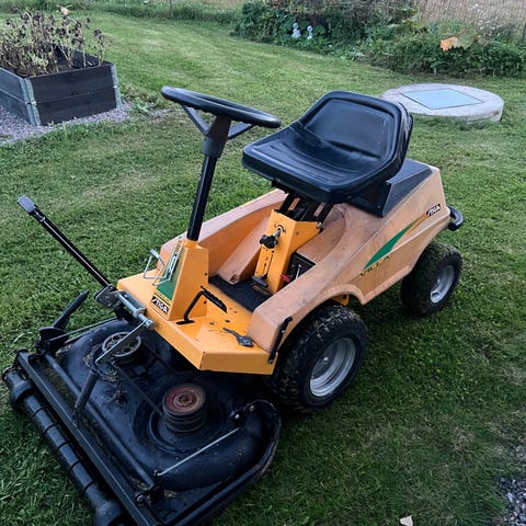 Tuollainen projekti. Putsaamaton ja likainen. Mutta sen alta löytyy ihan hyvä laite! Moottori 8hp B&S .Leikkuupöytä kohtuukuntoinen. Koneeseen löytyy myös katteet ja vaihdelaatikko. Vaihteiston kiinnikkeitä hitsattu. Nouto