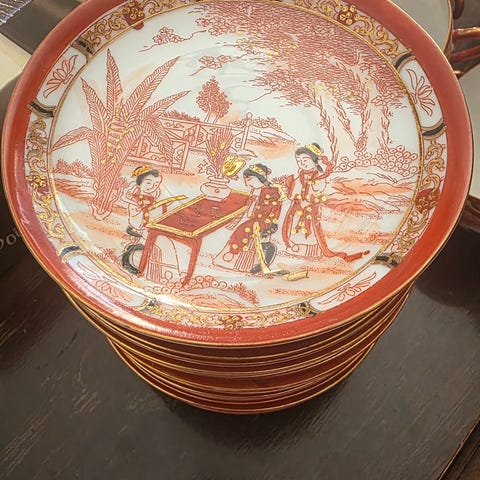 Myydään aito vintage munankuoriposliininen kaksi teekuppisetti lautasineen. Kuvioissa esiintyy naishahmoja, joilla on kimonot. Käsinmaalatut, joissa löytyy pieniä kulumia. Kuppien kuvioissa on pieniä eroja.