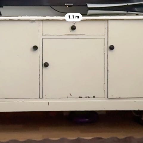 Vanha kunnon puuta oleva hylly tai esim tv taso. Alhaalla yksi laatikko.