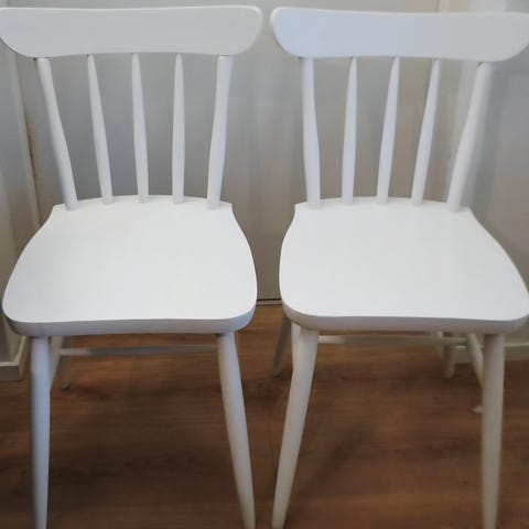 Valkeat pinnatuolit, myydään yhdessä. Kunto kohtalainen - toisessa tuolissa halkeama jalassa vaatii korjausta. Vain nouto. Yhteensä 30 €.