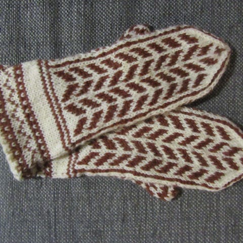 Novitan konepestävästä 7 veljestä langasta neulotut lapaset, englannin lakritsa kuvioilla. Koko n. 7.