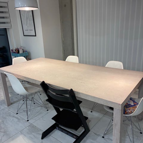 Annetaan lapsiperheen arjessa 5 vuotta kestänyt ruokapöytä. Pöydän pinta ja jalat on täynnä kolhuja ja tussin jälkiä.