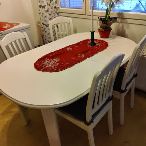 Siitäpä joutaisi ilmaiseksi ruokailuryhmä jollekin. Pöytä ihan ok kunnossa, mutta tuolit vähän keikkaisee kun löysästi kiinni. Pystyy kuitenkin istumaan ja siitä pienellä vaivalla tuolit kuntoon. En varaile, vaan menee sille joka ekana hakee. Mielellään haku 25pvä mennessä.