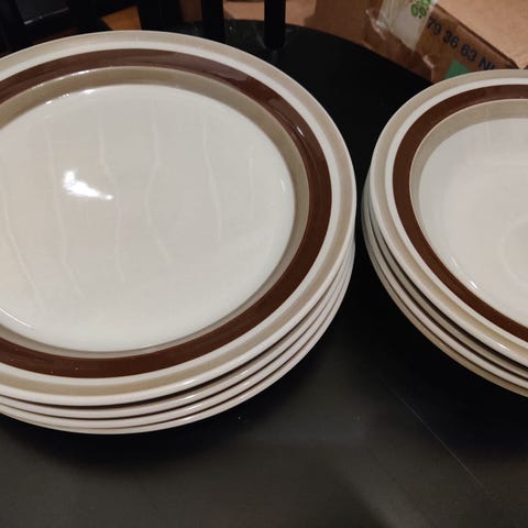 Arabia Pirtti-sarjan kinkku-/tarjoiluvati/lautanen, posliinia, tukeva, painavahko. Lautanen on väriltään vaalea, ja sen reunoilla on ruskea koristekuvio. Sopii yleiskäyttöön keittiössä ja ruokailussa. Halkaisija 32cm.