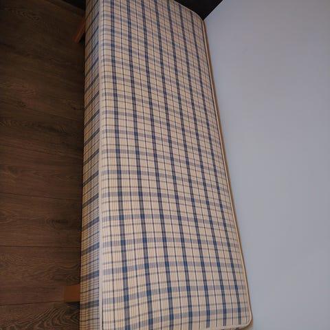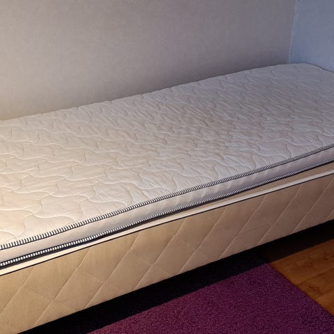 Hyvässä kunnossa oleva runkopatjasänky, nukkaa petarin alla ja pieni repeämä. Petarin saa halutessaan mukaan!