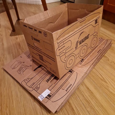 Kymmenisen ruokakaupan laatikkoa, jotka käyvät mainiosti muuttoon jne. Luultavasti muutama muukin laatikko, jotka saa kasaan.