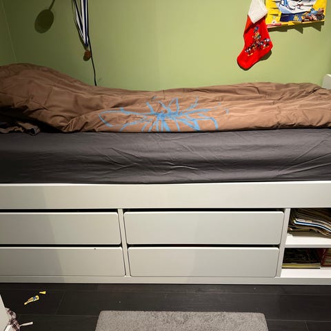 Sänky on hyvässä kunnossa, hyvin vähän käytetty, patja sisältyy hintaan. Joitakin pieniä käytön jälkiä on, jotka ovat kiinnittyneet kuljetuksen aikana. Vahvistetut säleet ovat paikoillaan.