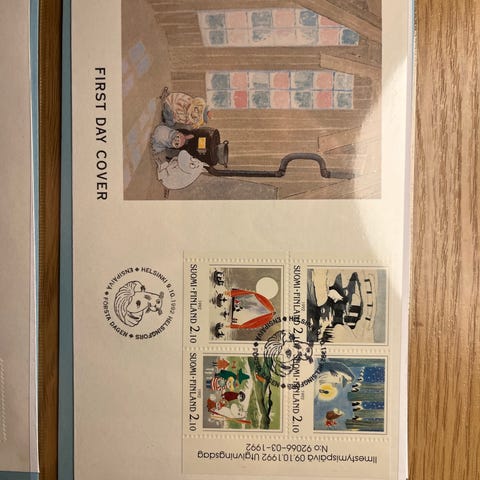Muumi ensipäiväkuori & 28 Muumi postimerkkiä