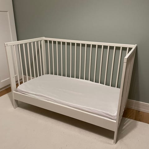Kahdella lapsella käytetty. Ei juuri käytönjälkiä. Toisen puolen laita liikkuu kolmeen tasoon, ei saa irti. Mukaan saa halutessaan pinnasuojan, patjan ja petarin.
